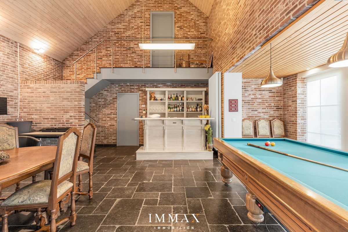 Gelijkvloers: inkom/traphal - toilet/vestiaire - open keuken met lichtrijke eetplaats - koelcel - leefruimte - tv-salon - hobbyruimte met bar - technische berging - kantoorruimte - garage - binnenzwembad met sauna.