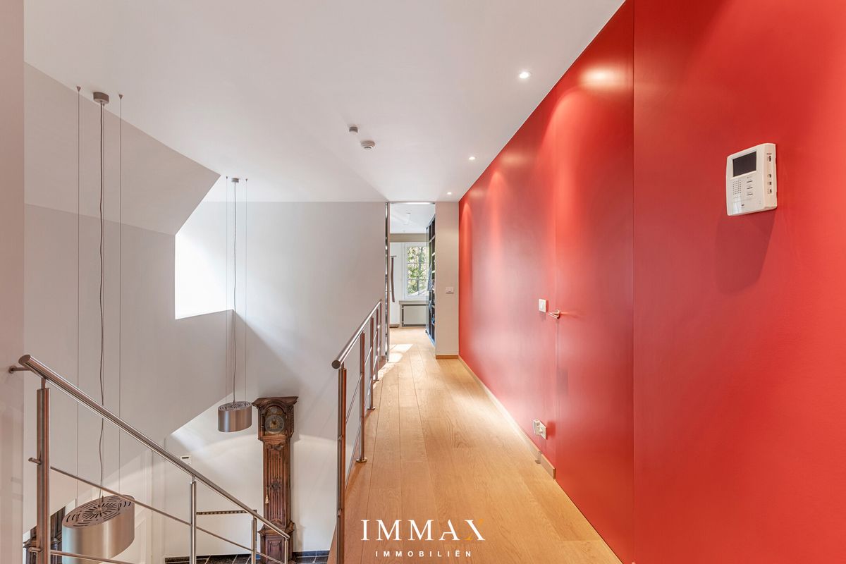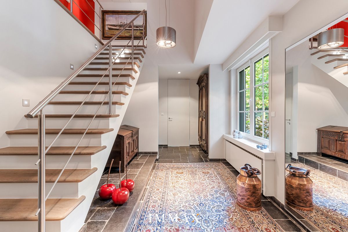 1ste verdiep: 4 stijlvolle ingerichte slaapkamers (2 master-bedrooms met dressing en badkamer) - apart toilet op de nachthall - 2 aparte gastenkamers boven de hobbyruimte. Een ruime bergzolder is toegankelijk via uitschuifbare trap.