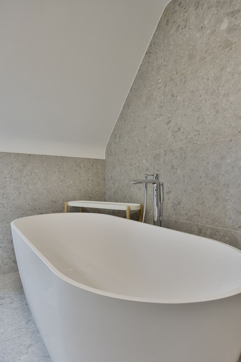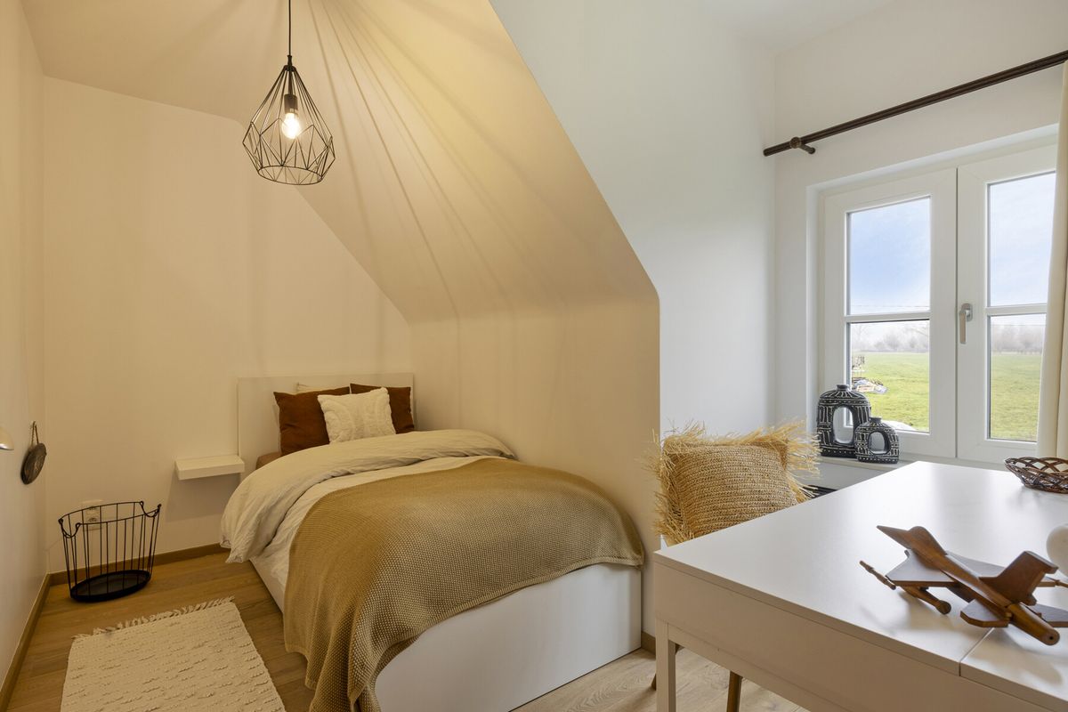 Grâce à un superbe escalier, vous accédez au premier étage, où se trouvent une salle de bains moderne avec baignoire et douche, ainsi que quatre chambres spacieuses et un dressing.