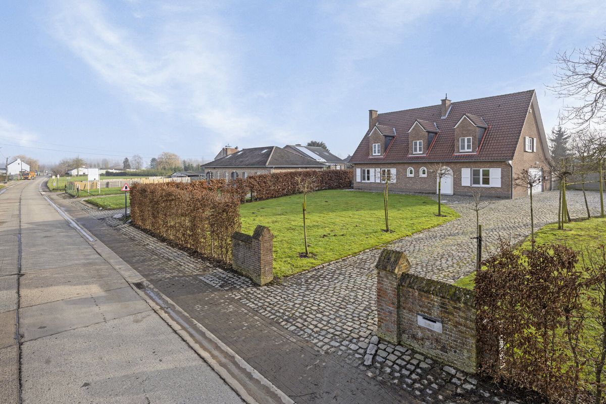 Cette villa rénovée, située sur un terrain de 19a, offre une vue panoramique sur les champs et une longue allée avec plusieurs places de parking et une borne de recharge.