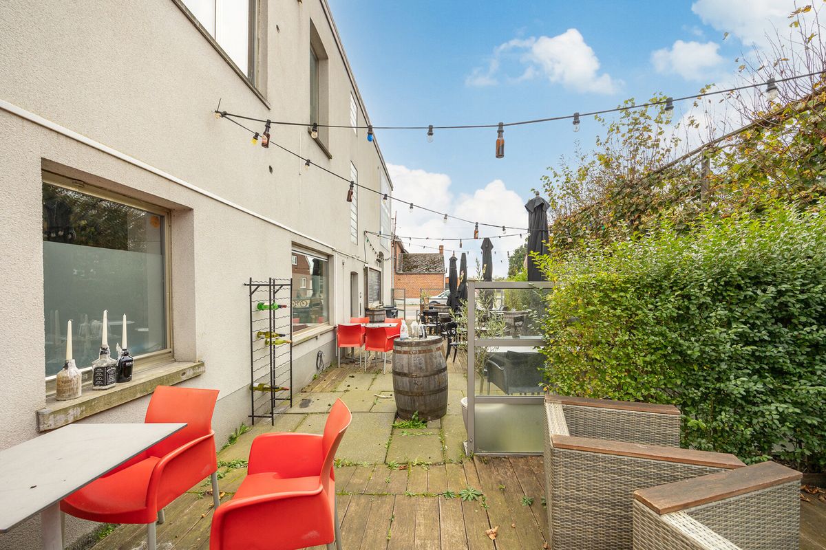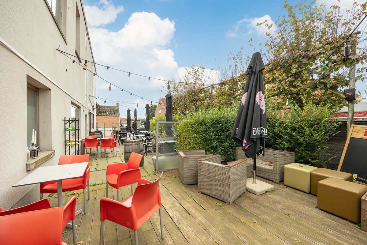 De gezellige handelsruimte biedt plaats aan ongeveer 55 zitplaatsen binnen en 60 op het terras. De bar, vernieuwd in 2017, is volledig uitgerust met onder andere koelkasten, tapkranen en een muziekinstallatie. De praktisch ingerichte keuken, bereikbaar via twee aparte ingangen, beschikt over een gasfornuis, afzuigkap, koelkasten en meer. Daarnaast is er een wasplaats, koelcel en aparte berging aanwezig. Extra opbergruimte is te vinden in de kelder, die toegankelijk is via een vaste trap. Het pand beschikt bovendien over twee aanpalende garages met sectionale poorten.