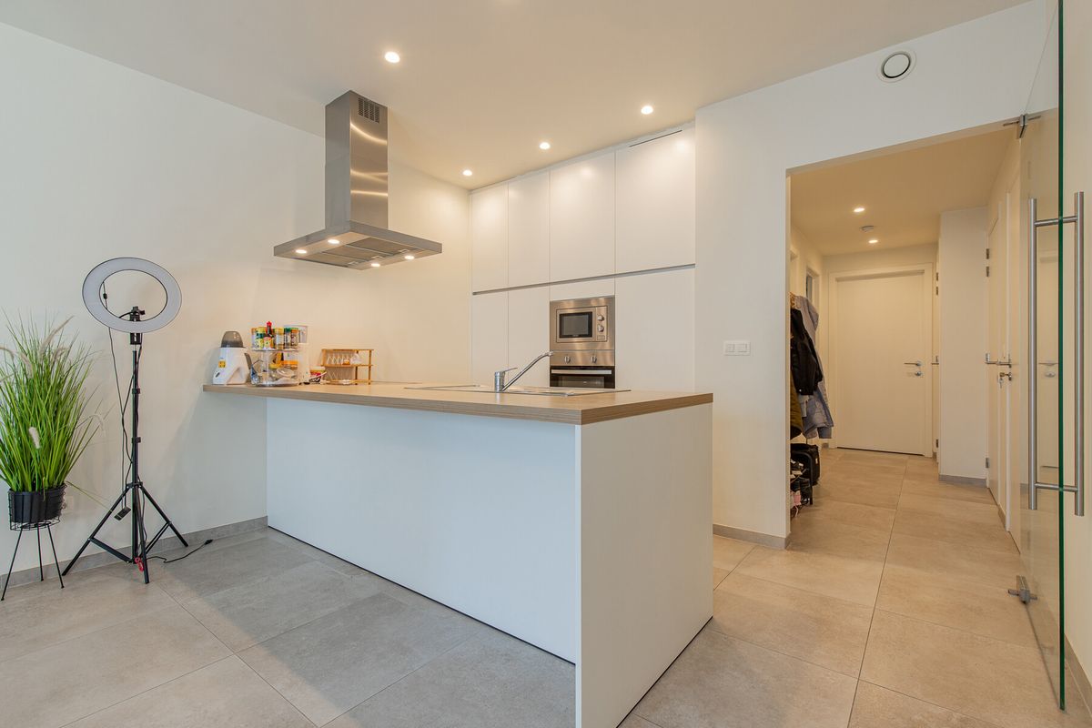 De inkomhal, met apart gastentoilet, geeft toegang tot de lichtrijke leefruimte met open, volledig ingerichte keuken. De grote raampartijen zorgen voor overvloedig daglicht. Van hieruit bereikt u het gezellig terras met prachtig uitzicht op de kerktoren. Het pand omvat verder twee slaapkamers, een praktische berging en een moderne badkamer met inloopdouche en dubbele lavabo.